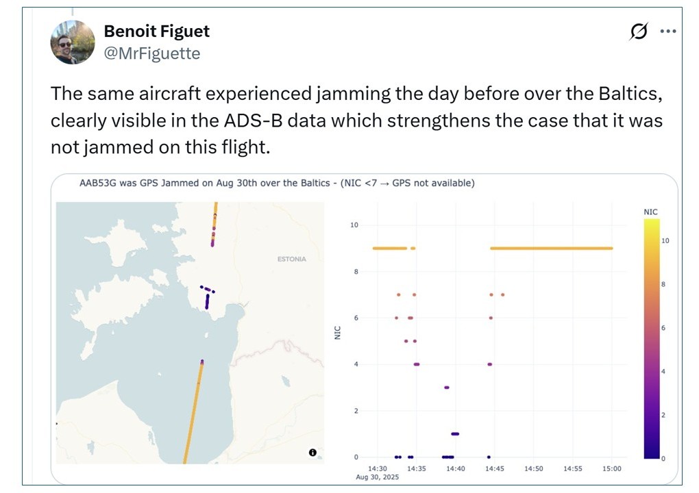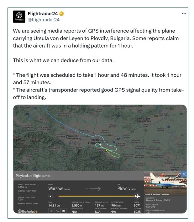 - BUT According to Benoit Figuet at GPSWise the same aircraft did report losing GPS the day before over the Baltics. – We wonder if the Bulgaria report was some government publicist trying to play “catchup.”