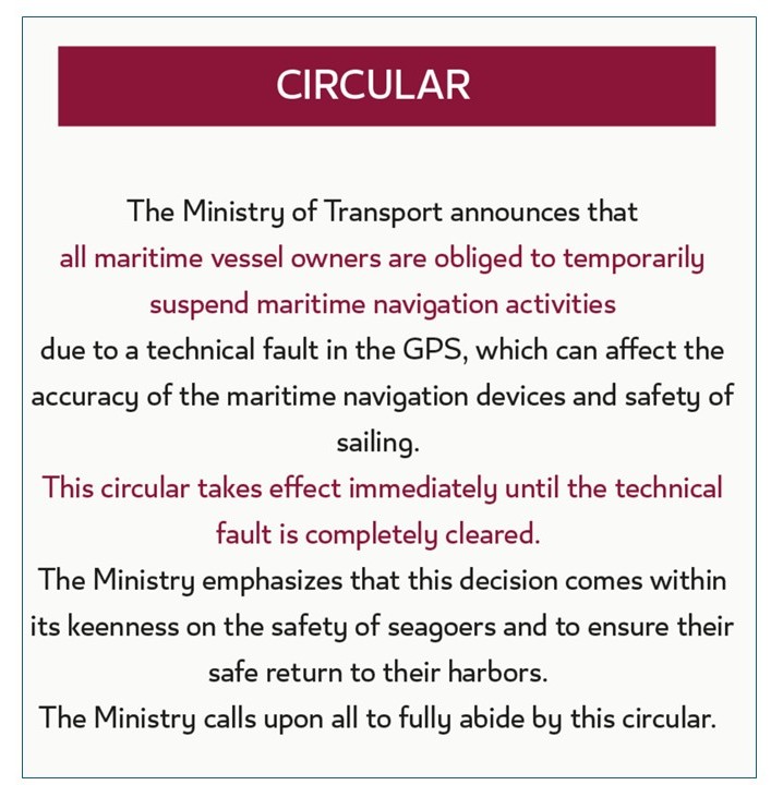 What’s new: The Qatar Ministry of Transport issued a circular temporarily halting all maritime activity for the nation and its waters because of “a technical fault in the GPS.”