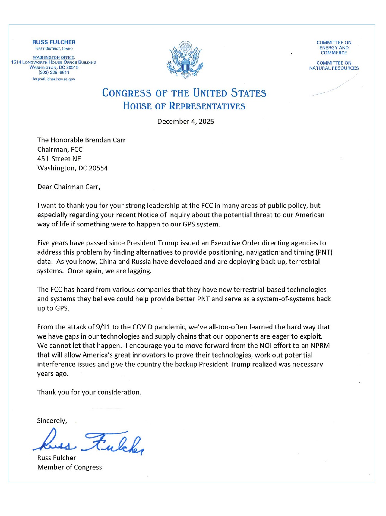 What’s new: Congressman Fulcher (R, ID) wrote to FCC Chair Carr saying: